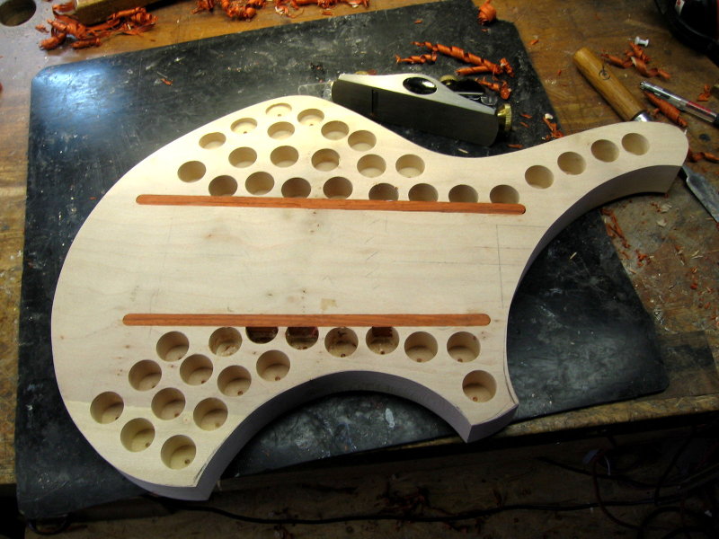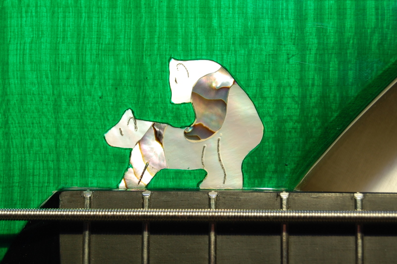 Als Holzbasis für den Korpus wählten wir Platane, die zur Gewichtsersparnis teilweise hohlgefräst und zur zusätzlichen Versteifung mit zwei Streifen Padouk versehen wurde. Die Decke wurde bookmatched aus Riegelahorn gefügt und, als besonders individuelles Detail infolge eines Wortspiels mit dem Spitznamen des Kunden, mit einem Perlmutt-Inlay in Form zweier Pandas - den "Bang-Bären" - versehen.