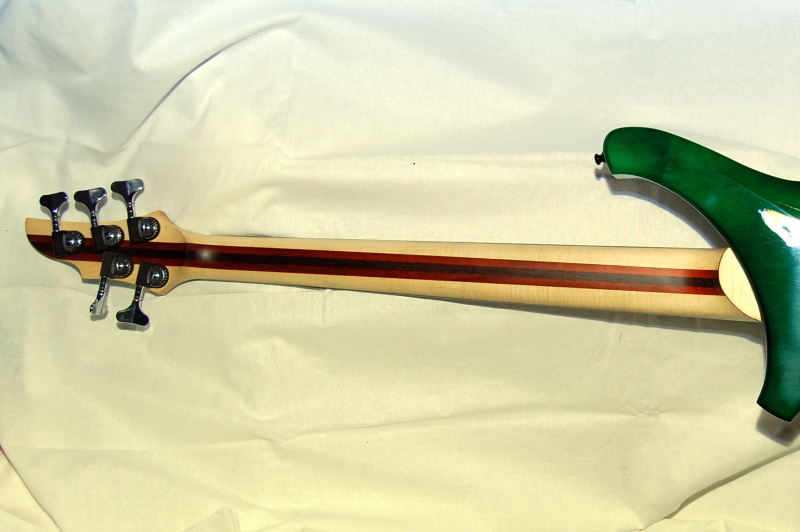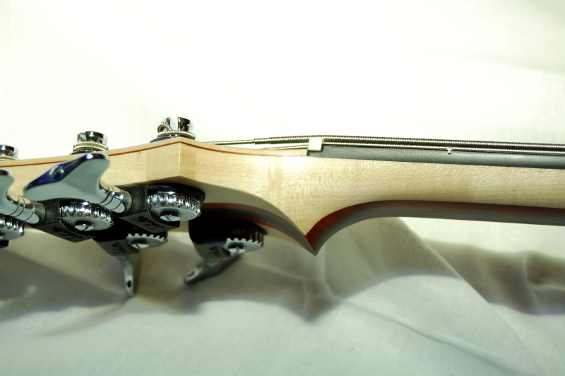 Der eingeleimte Hals ist fünfstreifig gesperrt aus Ahorn, Padouk und Wenge konstuiert und ermöglicht so ein flaches D-Profil, ohne an Steifheit und Stabilität einzubüßen. Das Ebenholz-Griffbrett wurde bis auf die Sitedots aus Perlmutt naturbelassen.