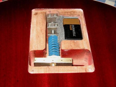 Ein Schlagbrett aus Kunststoff in der Größe schrumpft und verzieht sich mit der Zeit. Darum habe ich hier ein Ebenholz/Ahorn Sperrholz angefertigt. Die Noten sind auf Pickguard und Pickups lackiert, in das Griffbrett eingelegt. Der Hals ist in den Hollowbody eingeleimt. Damit die Statik nicht leidet, ist das Schaller FR II statt mit der üblichen Federkammer mit einer Druckfeder und einem dafür angefertigten Verstellmechanismus ausgestattet. Die furnierten Pickups sind von EMG und damit das Teil auch königlich röhrt, ist noch ein Midboost eingebaut. Selbstverständlich sind alle Knöpfe aus Ebenholz gedrechselt.