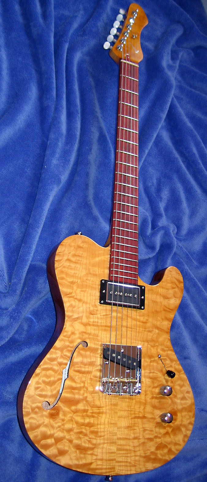 Tatsächlich war es eine sehr gute Gitarre geworden, die mein Mitarbeiter Tim (darum der Name: Timlein) da gebaut hatte. Ein dreiteiliger Hals aus wunderschönem Riegelahorn und einem Streifen Paduk, der in einen hohl gefrästen Body aus Mahagoni geleimt war. Die sehr leichte Gitarre mit einer 650mm Mensur überzeugt durch eine präzise Tonentwicklung, was ich neben der hohlen Konstuktion der Verwendung von viel Paduk Holz zuschreibe; ein relativ leichtes, aber festes Material, was so lecker riecht, wie es aussieht.